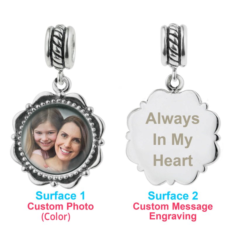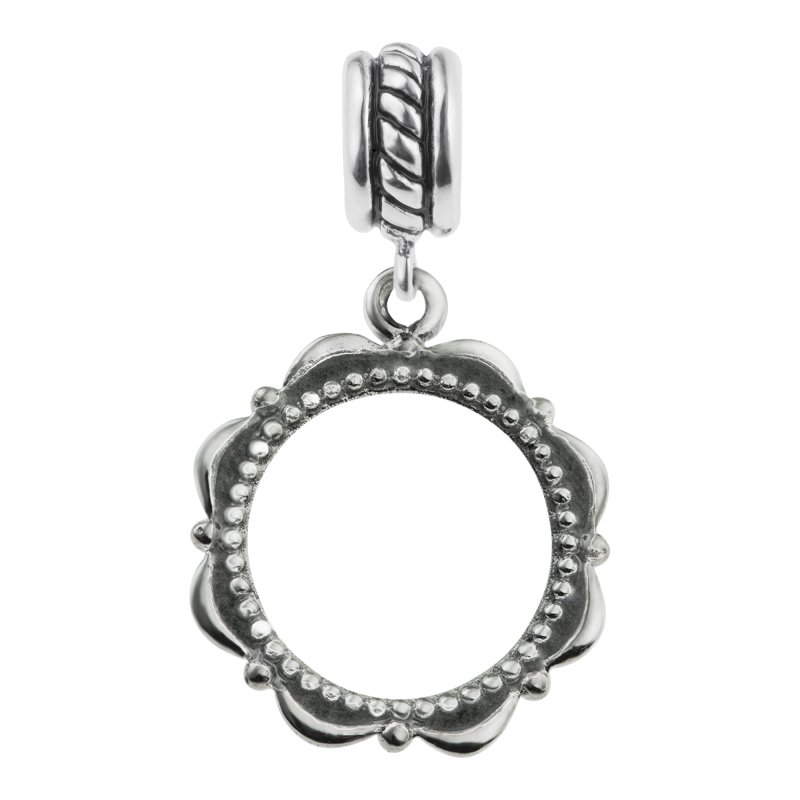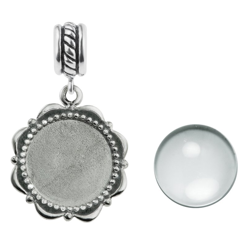 Make your memories wearable. This 925 sterling silver dangle charm features a customizable glass photo inlay, an antiqued finish, and a large 4.7mm hole to fit most European charm bracelets.