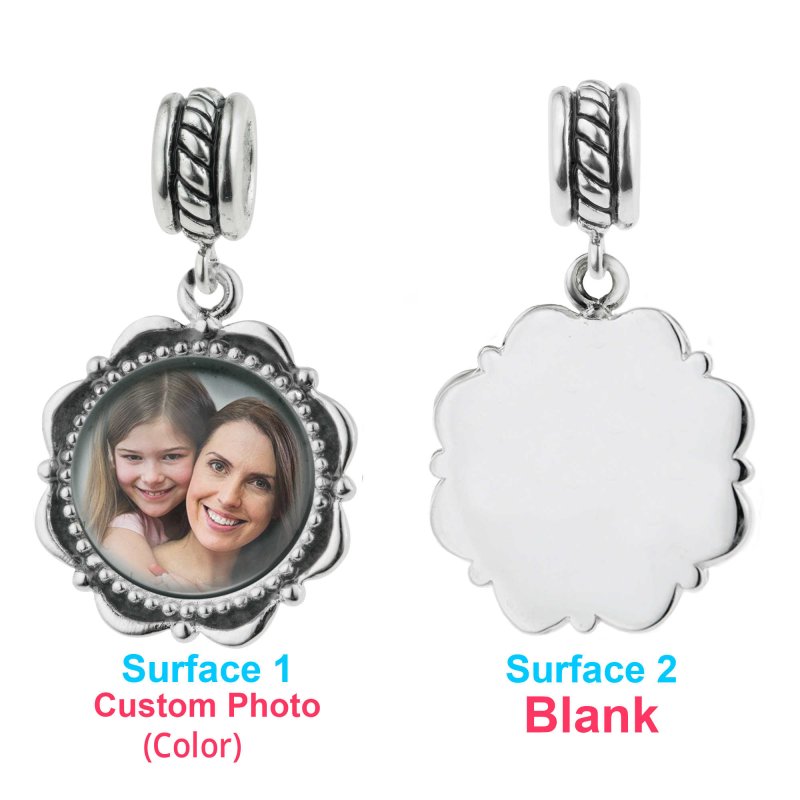 Make your memories wearable. This 925 sterling silver dangle charm features a customizable glass photo inlay, an antiqued finish, and a large 4.7mm hole to fit most European charm bracelets.