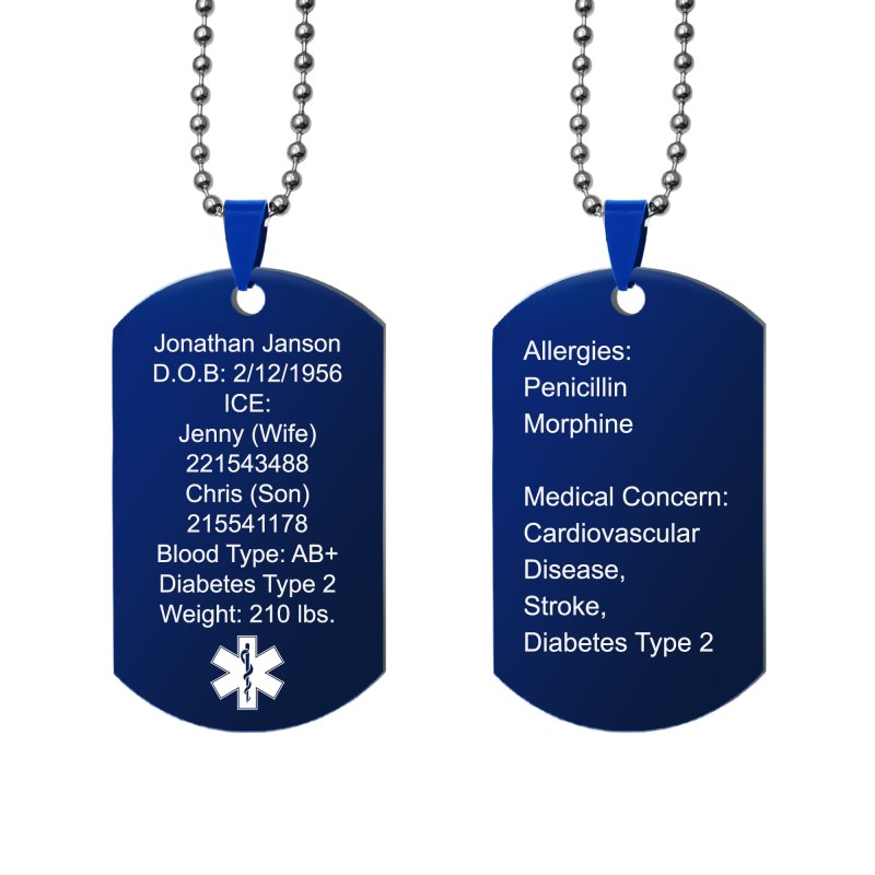 Personalized Medical Alert Emergency Med Id Identification Engraved Stainless Steel Custom Dog Tag Military Pendant Ball Chain Necklace 24" Gift - Blue