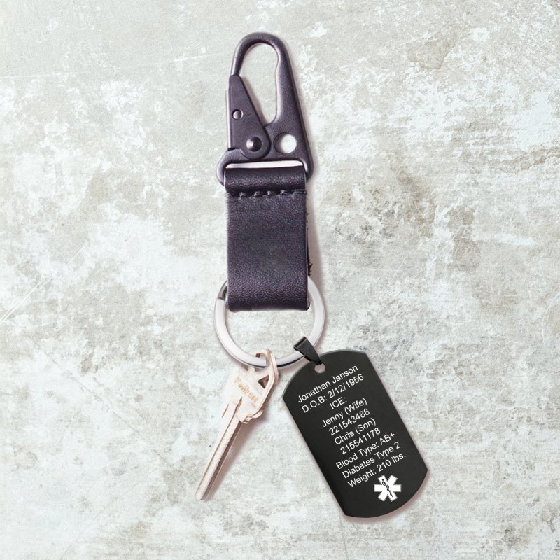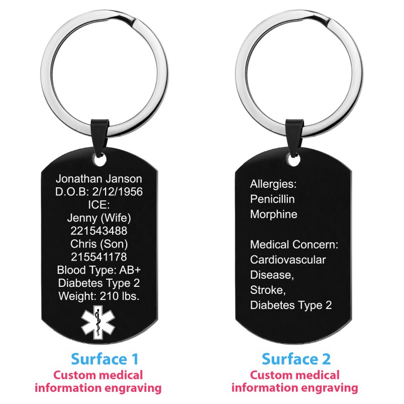 Personalized Medical Alert Emergency Med Id Identification Engraved Stainless Steel Custom Dog Tag Military Pendant Key Chain - Black